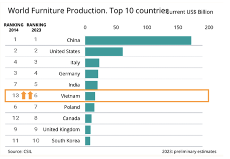 이탈리아 경제산업연구센터(CSIL) 보고서에 따르면, 2023년 기준 베트남은 세계 6위의 가구 생산국으로 자리 잡았다. 이는 2014년 13위에서 급성장한 결과로, 지난 10년 동안 베트남의 가구 산업이 다른 나라보다 빠르게 성장했음을 보여준다. 베트남은 주로 아웃도어 가구를 생산해왔지만, 최근에는 실내 인테리어 시장으로 빠르게 확장하고 있다. 현재 베트남의 총 가구 생산량 중 약 23%를 실내 장식품이 차지하고 있으며, 아시아-태평양 지역 인테리어 제품 생산량 중 약 10%를 차지하고 있다. 또한 베트남은 중국 다음으로 유럽과 미국으로의 수출이 가장 활발한 국가로, 미국은 2016년 이후 지속적으로 베트남 가구 수출국 1위를 차지하고 있다.