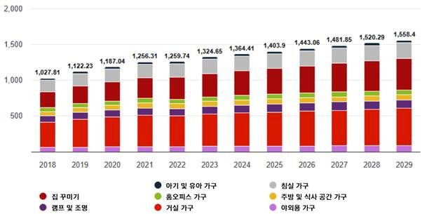 시장조사기관 Statista에 따르면, 2024년 베트남의 가구 시장 규모는 13억6441만 달러를 기록했다. 베트남 가구 시장규모는 지속적으로 증가해 2029년까지 연평균 2.6% 성장해 15억5840만 달러에 달할 것으로 전망된다. 베트남 가구 시장은 거실 가구(33.9%), 홈 데코 제품(25.3%), 그 외 램프 및 조명, 유아용 가구, 홈오피스 가구 등으로 구성된다.